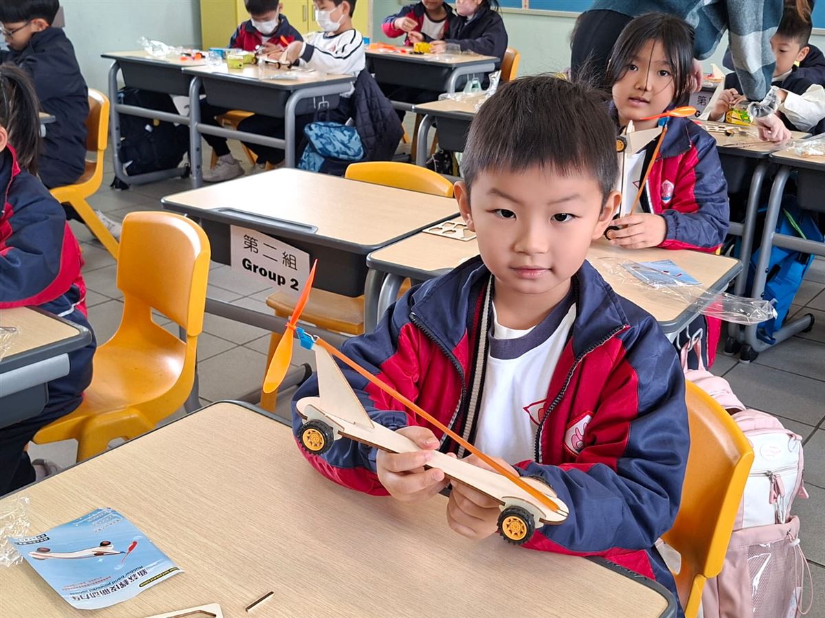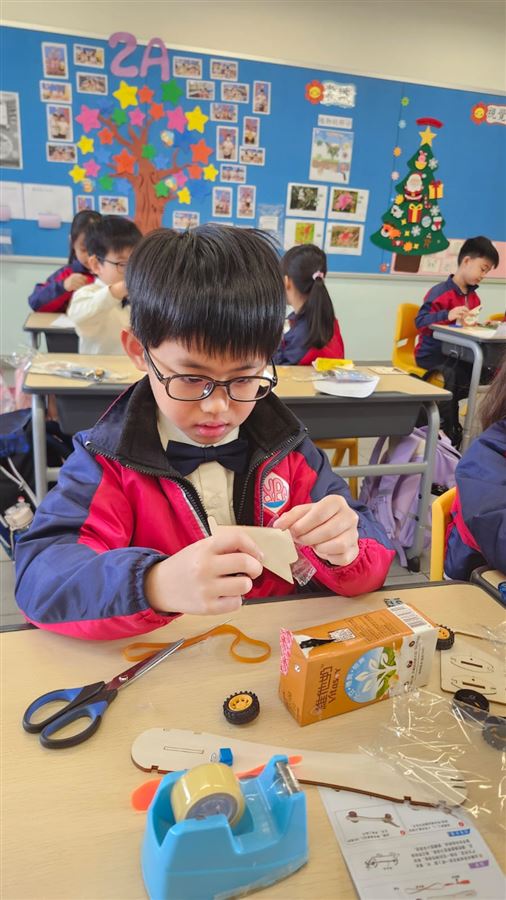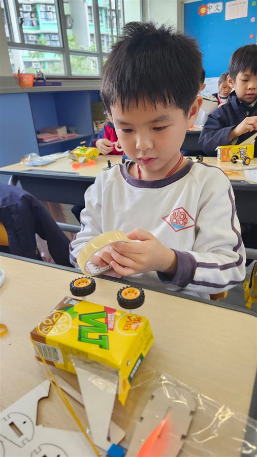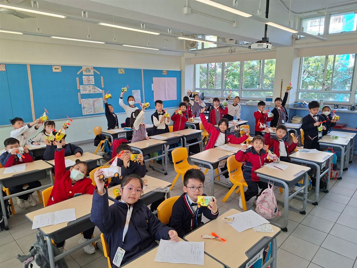 本次二年級STEAM DAY以「環保動力車」為主題。學生運用塑膠瓶、紙盒等廢棄材料,動手設計並組裝車輛。過程中,孩子們透過測試與調整,探索影響速度與穩定性的原理,並將科學知識融入創意實踐。活動最終以趣味競賽作結,讓學生展示獨特的作品與學習成果。